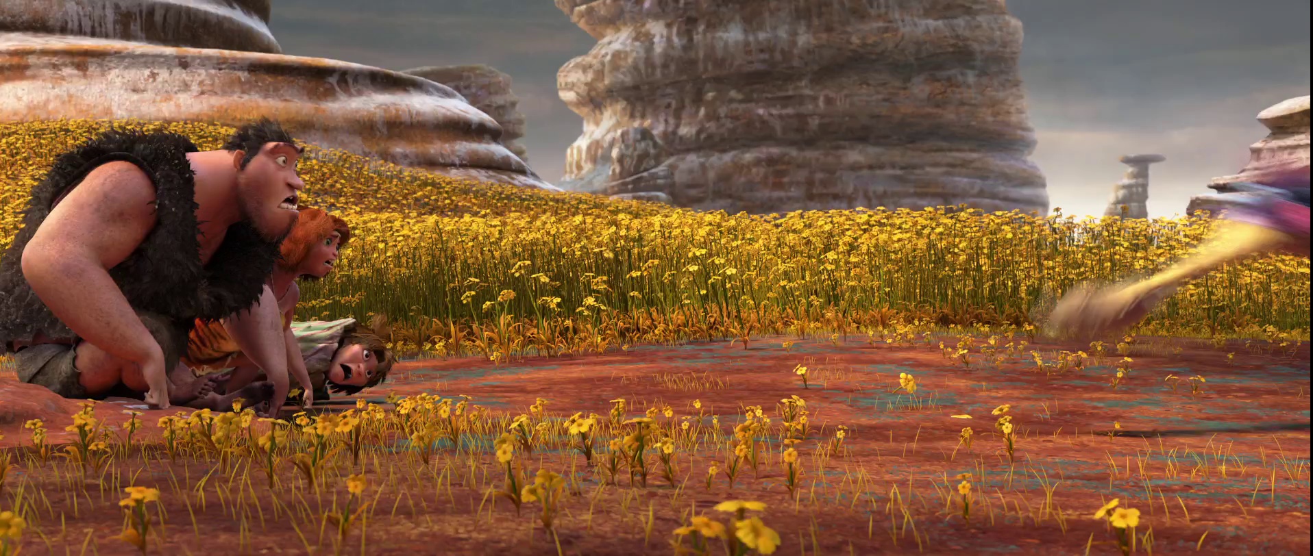 没想到世界末日突然降临,山洞被毁,一家人被迫离开家园,展开一场全新的旅程。离开了居住了“一辈子”的山洞,展现在他们眼前的是一个崭新绚丽却又充满危险的新世界,到处都是食人的花草和叫不出名字的奇异鸟兽,一家人遇到了全所未有的危机。在旅途中,他们还遇到了游牧部落族人Guy(瑞恩·雷诺兹 Ryan Reynolds 配音),他有着超凡的创造力和革新思想,帮助咕噜一家躲过了重重困难,途中他还发明了很多“高科技”产品,并让他们知道了原来生活需要“用脑子”,走路需要“鞋子”等等。一行人在影片中展开了一场闹腾而又惊险的旅程。